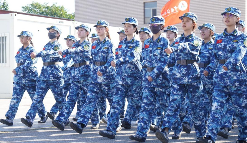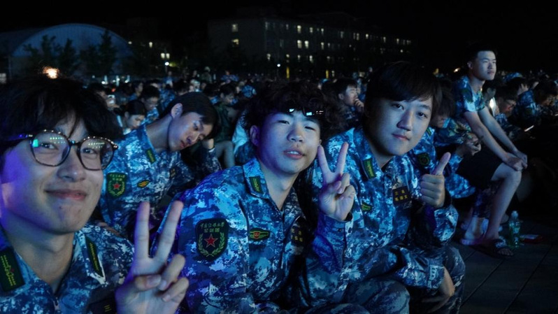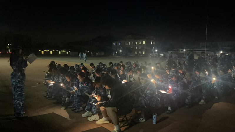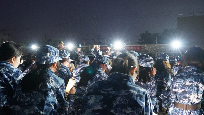 连队晚上的晚训是新生们学唱军歌和校歌的时间。不论是《强军战歌》中“国要强,我们就要担当”,还是《校园里有一排年轻的白杨》中的“珍惜春光”,都传递出新生们奋发向上、积极进取的青春力量。