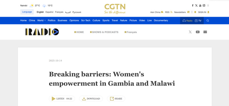 10月13日至14日,2025年全球妇女峰会在北京举行。会议期间,中国传媒大学信息传播学院2025级发展中国家国际传播硕士生孙雅蓓(Jainaba Sonko)与美娜(Tamara Chafunya)接受CGTN采访,围绕中国在非洲女性赋权领域的实践与贡献,分享了她们的亲身体验与思考。