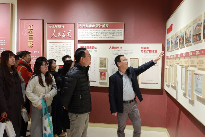 在人邮社教育出版中心总经理李海涛的引领与介绍下,师生们首先调研了人邮社社史厅。李海涛为师生系统梳理了出版社自成立以来的发展脉络,以及近年来在专业出版、技术创新等领域的最新成果。