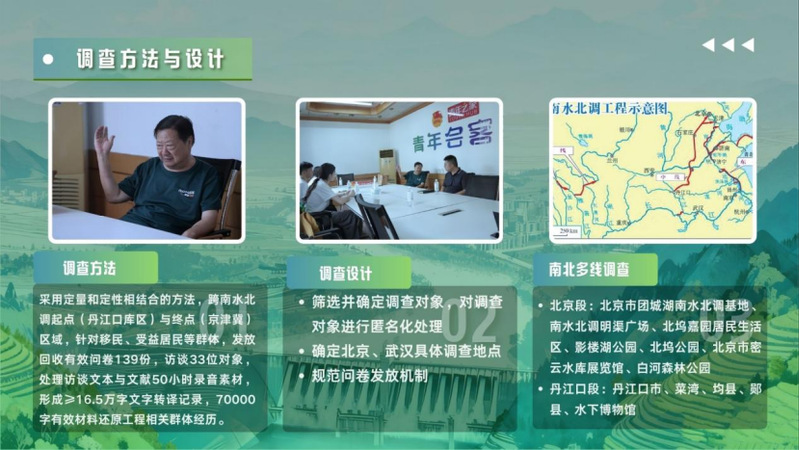 基于此,调研小组提出三个研究问题:第一,南水北调中线工程如何重新书写“水文化”?第二,移民群体在工程进程中实现了怎样的身份转变?第三,南水北调工程在水源地与受水区的传播实践呈现出哪些差异?当前南水北调工程传播如何实现从“技术宣讲”到“价值沟通”的转变?