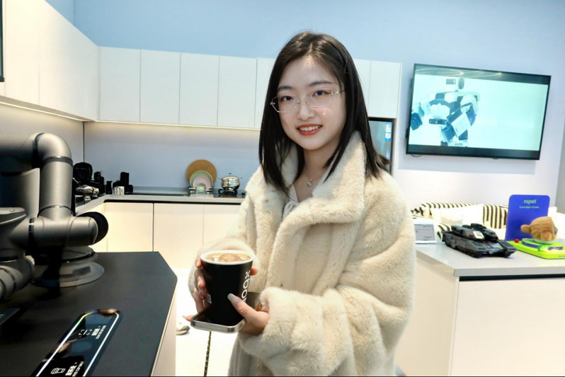 在家庭应用展区,多种机器人展示了生活场景中自然的交互能力,引发同学们对“人机共生”的热烈探讨。师生还体验了具备AI识别与印花功能的全自动咖啡机。