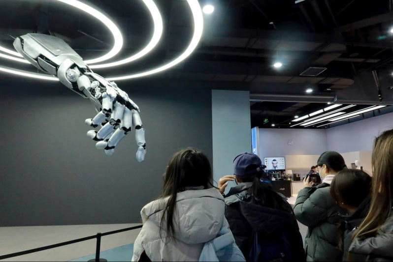 调研团队随后到访北京经开区“机器人大世界”,近距离感受机器人技术的发展趋势与多元化应用。进入展馆,师生在工作人员的引导下先与“巨型机械手”装置进行了互动,体会到不小的震撼。