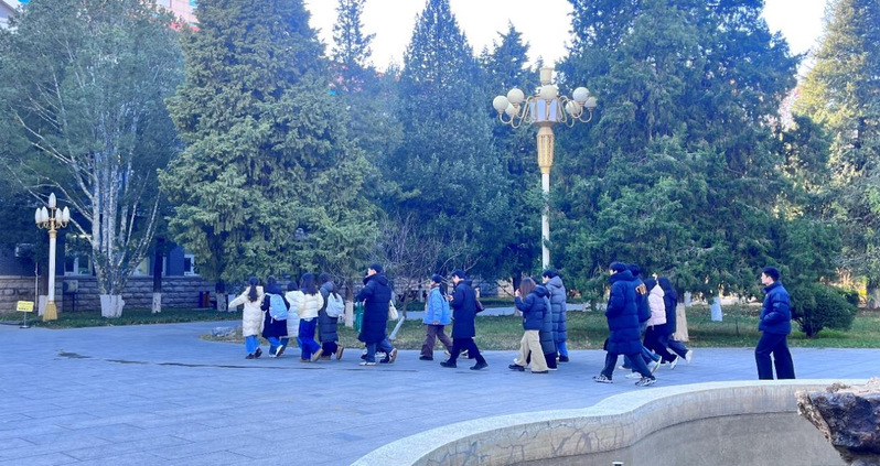 中午,2025级新生们在42号楼前集合,在工作人员的引导下统一出发。健步走路线串联起校园内多处标志性景观:从北苑食堂出发,途经樱花大道、梧桐大道,在孔子广场完成首次知识问答;随后队伍穿过核桃林与红枫大道,经过文化广场与阳明书院,最终抵达图书馆前的第二个答题点。