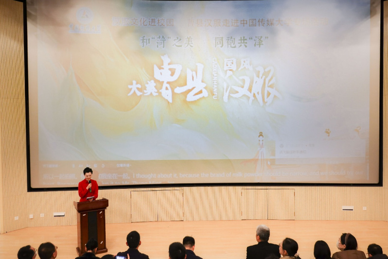 曹县县委常委、组织部部长赵洁介绍了曹县汉服产业的发展情况。曹县发展以工业和科技为主导,是全国电商“高地”,尤其以汉服闻名。此外,曹县十分注重文化研究与人才培养,希望未来能邀请中国传媒大学师生共同体验当地的文化和发展。
