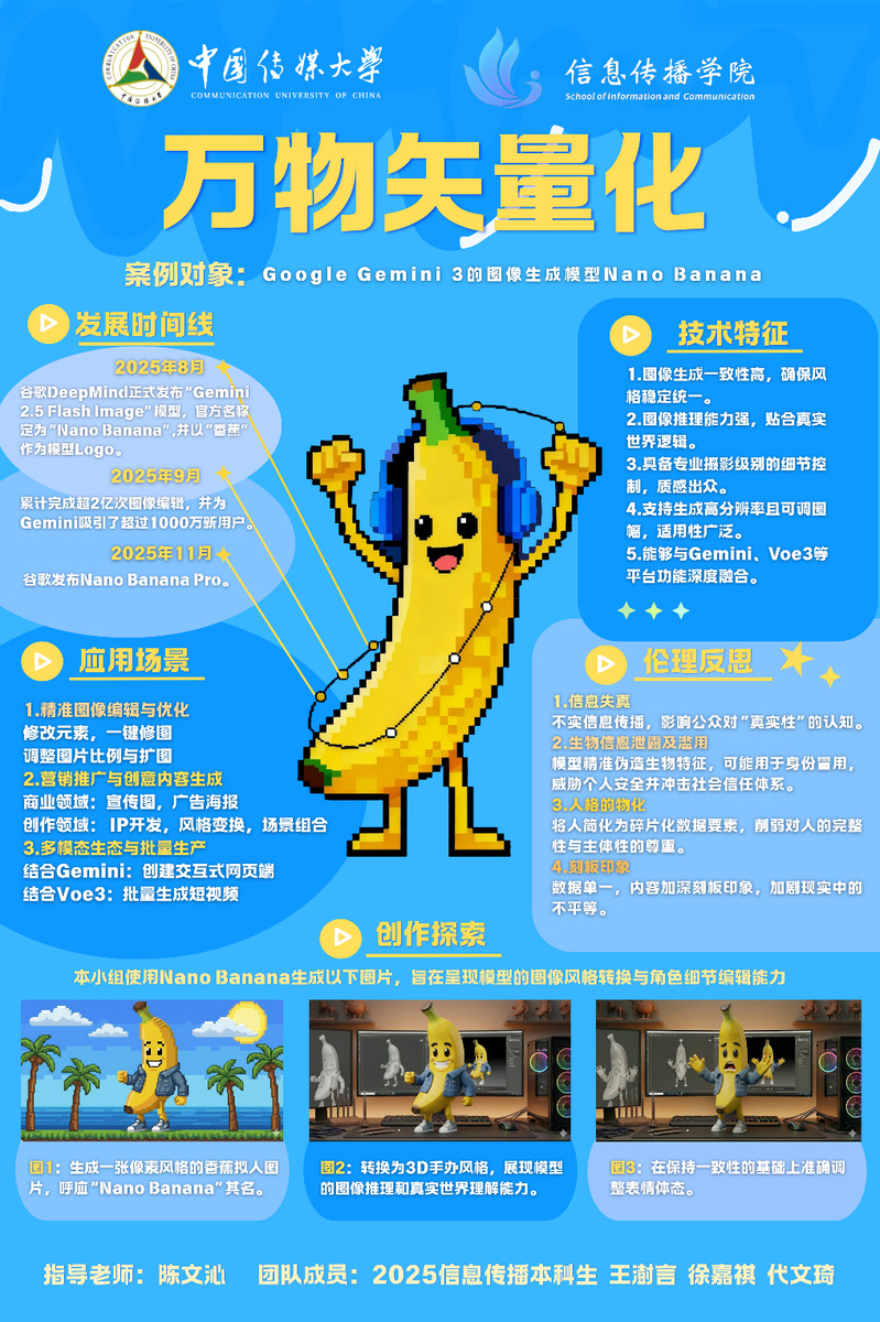 作品基于模型名称,围绕“香蕉”意象进行设计,并通过亲身试验表现其性能,充分展现了“Nano”的轻量高效和“Banana”的亲切幽默等特性。