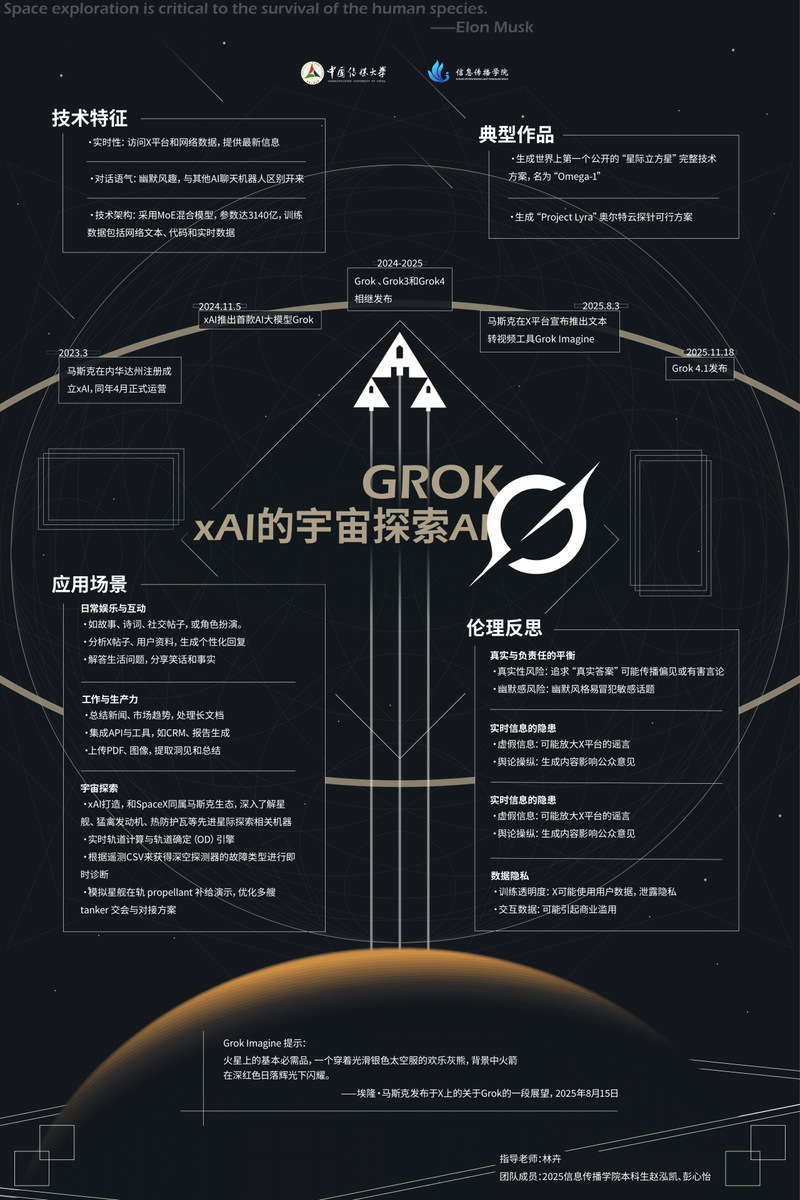 作品聚焦xAI的Grok AI,强调其在宇宙探索中的技术定位与创新。展示发展时间线、典型产品如Omega-1与Project Lyra、应用场景及伦理反思,启发未来科技思考。