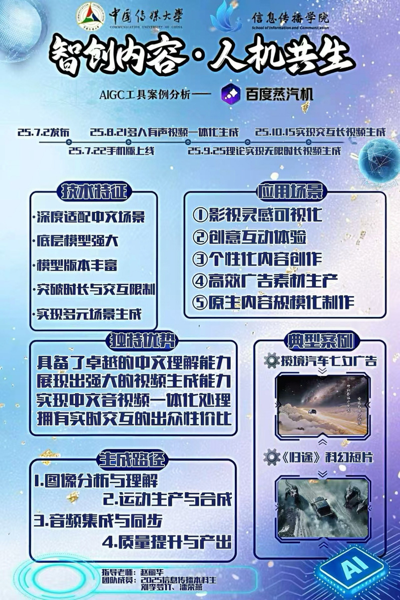 作品围绕百度蒸汽机展开深度解析。海报通过时间节点梳理、技术特征拆解、应用场景归纳、独特优势分析、生成路径梳理及典型案例展示六大维度,系统剖析了百度蒸汽机从2025年7月2日发布到实现交互长视频生成的迭代历程,凸显其深度适配中文场景、突破时长与交互限制等核心技术亮点,以及在影视创作、广告生产等领域的多元应用价值,是结合专业知识对AIGC前沿工具的实践分析与研究成果。