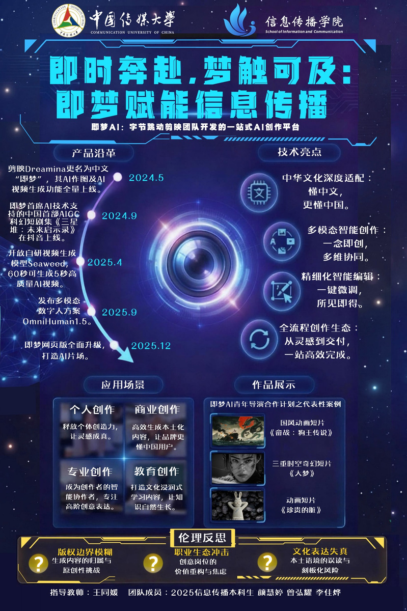 本作品围绕字节跳动剪映团队推出的一站式AI创作平台“即梦AI”,从信息传播视角梳理其如何降低创作门槛、提升内容生产效率并重塑传播链路。即梦以中文语境与中华文化适配为基底,整合文生图、图生视频、智能编辑与多模态协同等能力,使创作者能够从灵感生成、素材加工到成片交付一站完成。作品通过产品沿革与典型案例,展示即梦在个人表达、商业营销、专业创作与教育场景中的赋能路径,同时提出版权边界、职业生态冲击与文化表达失真等伦理议题,呼吁在效率跃迁之外建立可追溯、可治理的内容生产规范。