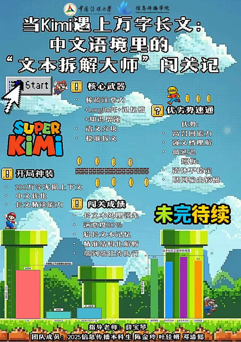 作品以经典游戏《超级马里奥》为视觉框架,聚焦Kimi大模型在中文语境下的长文本拆解能力展开分析。海报将Kimi的技术特点与游戏闯关元素结合:以“开局神装”标注其200万字无损上下文、中文优化等基础能力;用“核心武器”点明稀疏注意力、语义分块等核心技术;通过“优势速通”梳理高召回、强文档理解等优势与语体不稳定等短板;并以“闯关成绩”总结其在长文本处理、精准解析等方面的表现。作品整体形式趣味化,内容则清晰呈现了Kimi大模型长文本处理的技术特征与实际表现。