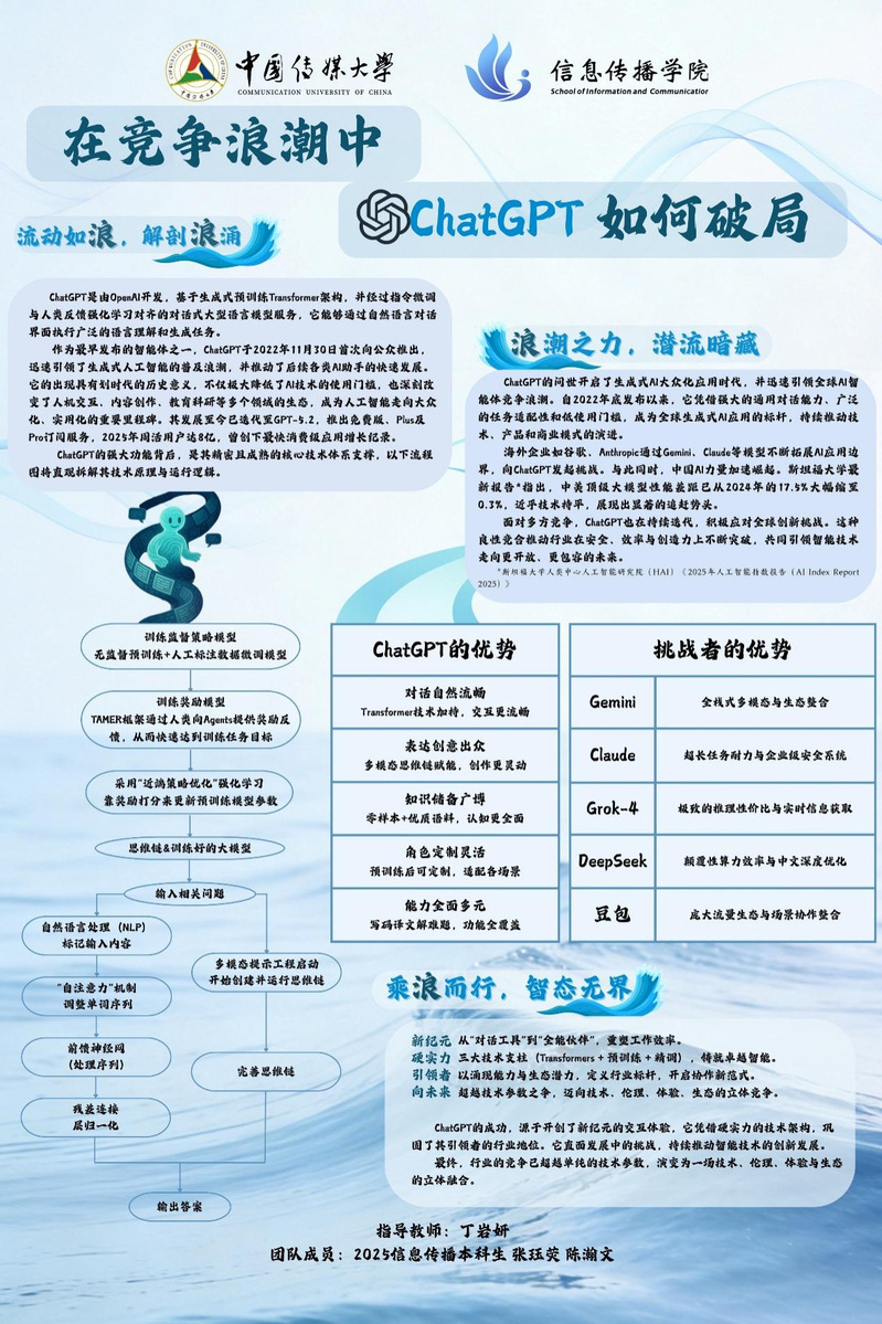 作品围绕ChatGPT展开多维度分析。海报首先介绍ChatGPT作为OpenAI开发的生成式AI产品,自2022年推出后掀起行业浪潮,2025年用户达8亿的发展现状,并通过流程图拆解其技术原理;接着对比ChatGPT与Gemini、Claude、豆包等竞品的优势,展现生成式AI领域的竞争格局;最后指出ChatGPT以技术架构奠定行业引领地位,而行业竞争也从技术参数比拼,演变为技术、伦理、体验与生态的立体竞争,未来将朝着更开放包容的方向发展。