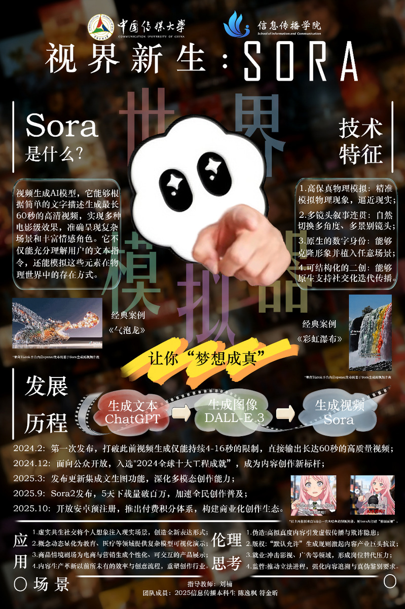 作品聚焦AI视频生成模型Sora展开多维解析。内容上先界定Sora的AI模型类别,再梳理其技术特征与发展历程,还分析了其多领域应用场景以及技术带来的伦理思考。海报通过视觉化、结构化的设计,系统拆解Sora的技术内核与产业影响,既科普了前沿AI视频技术,也融入对技术伦理的深度反思,兼具知识性与现实探讨价值。