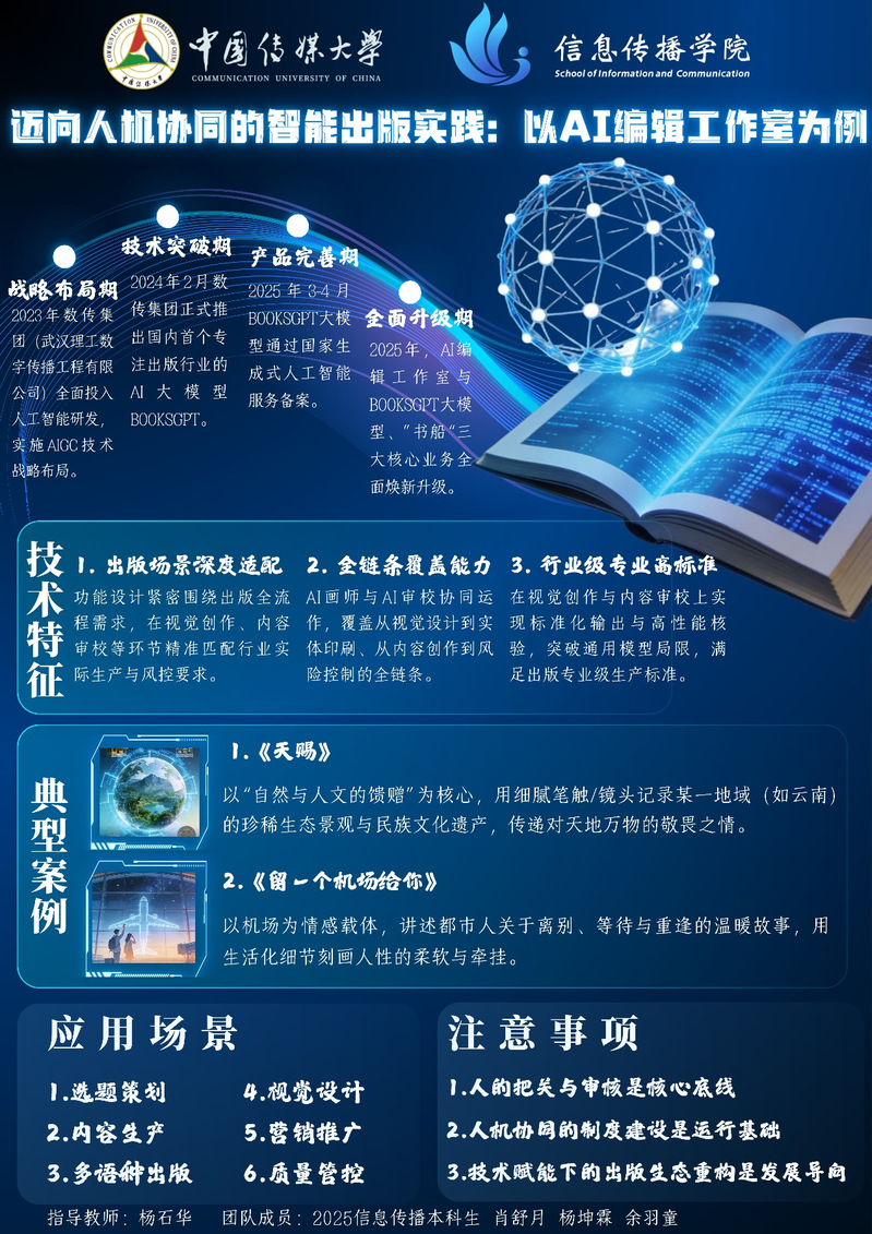 作品梳理了智能出版的发展阶段,从2023年数传集团的技术战略布局,到2024年推出AI大模型BOOKSGPT,再到2025年的产品完善与全面升级。核心展示了技术特征与《天赐》《留一个机场给你》两个典型案例,以及选题策划、内容生产等六大应用场景,同时强调人的把关审核、制度建设、生态重构三大注意事项,系统呈现AI赋能出版的实践路径与关键原则。