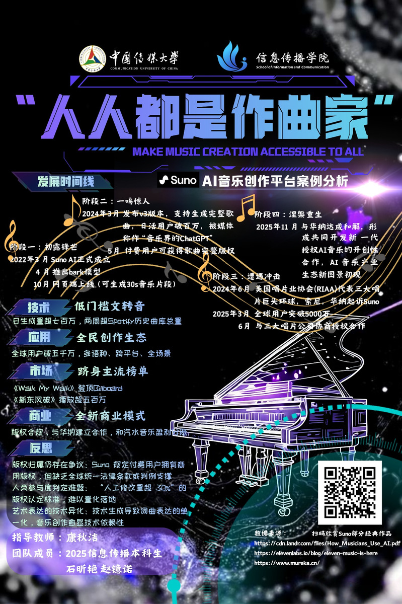 海报以研究成果为载体,聚焦Suno AI平台展开案例分析,梳理其从2022年7月正式成立的“初露锋芒”阶段,到2024年3月发布v3版本、用户破百万的“一鸣惊人”,再到遭遇行业冲击后与华纳达成和解、开启“涅槃重生”的完整发展脉络。此外,团队也对版权归属、技术异化等行业争议展开反思。Suno AI与主流唱片公司的合作模式,为人机协同、人机共创的音乐产业新生态勾勒出先锋性的发展可能,凸显了该案例在AI音乐领域的前沿探索价值。