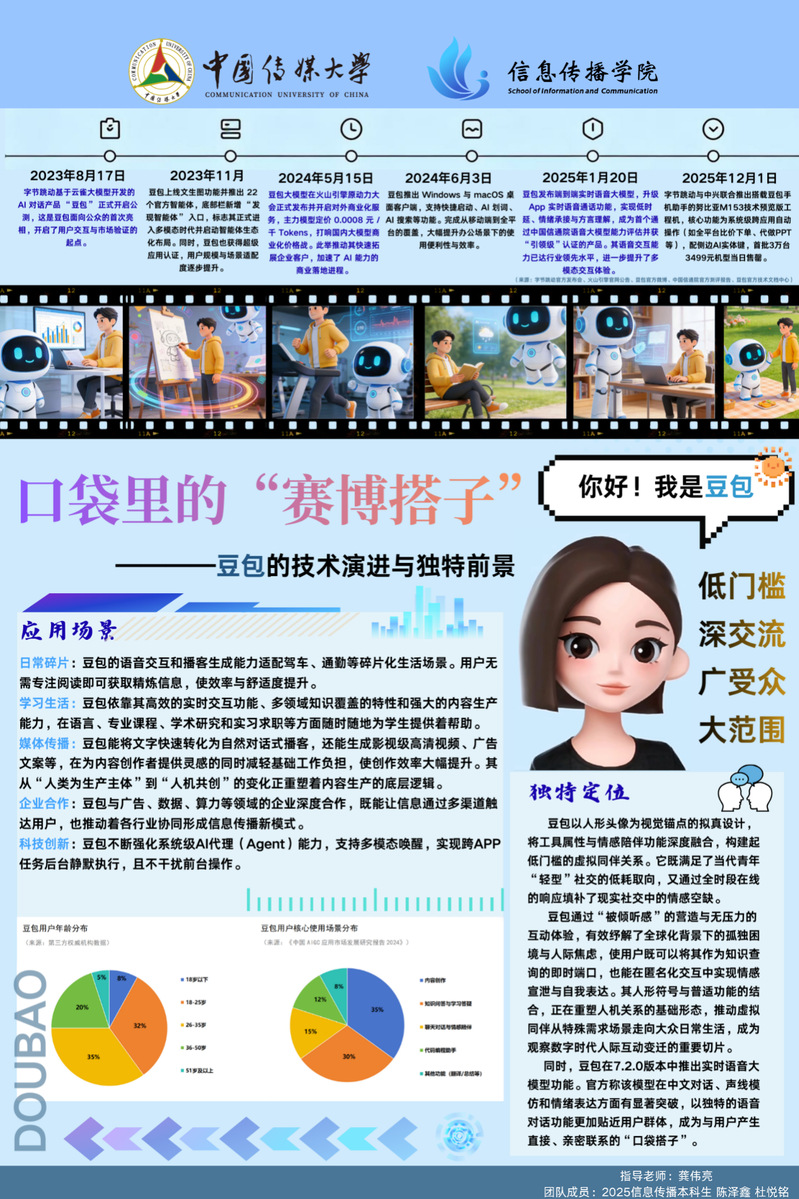 同时,海报通过数据图表展示豆包的用户年龄与使用场景分布,并阐释其“低门槛、深交流、广受众、大范围”的独特定位,分析其以情感化设计构建的“赛博搭子”关系,以及在人际互动、语音大模型技术上的突破,最终凸显豆包作为AI产品在信息传播领域的创新价值与研究意义。