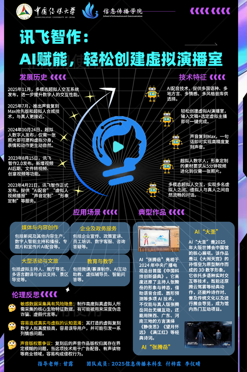 作品梳理了讯飞智作的发展历史、技术特征与应用场景,介绍了依托该产品的典型作品,并反思了其可能引发的伦理问题。讯飞智作是一款依托AI技术打造的虚拟演播室创建工具。该工具自2023年4月正式发布后持续迭代,从最初的AI配音、虚拟人定制等基础功能,逐步升级出声音复刻Max、超拟人数字人、多模态超拟人交互系统等核心技术,仅需一张照片即可构建高逼真虚拟分身,还能实现多语种、多方言的智能配音与自然交互。其应用场景覆盖媒体创作、政务服务、文旅活动、教育教学等领域,诞生了AI“张腾岳”“大圣”等典型作品。与此同时,讯飞智作也面临着敏感数据采集风险、虚实认知混淆、声音版权争议等伦理问题,成为AI虚拟技术发展中需要正视的课题。