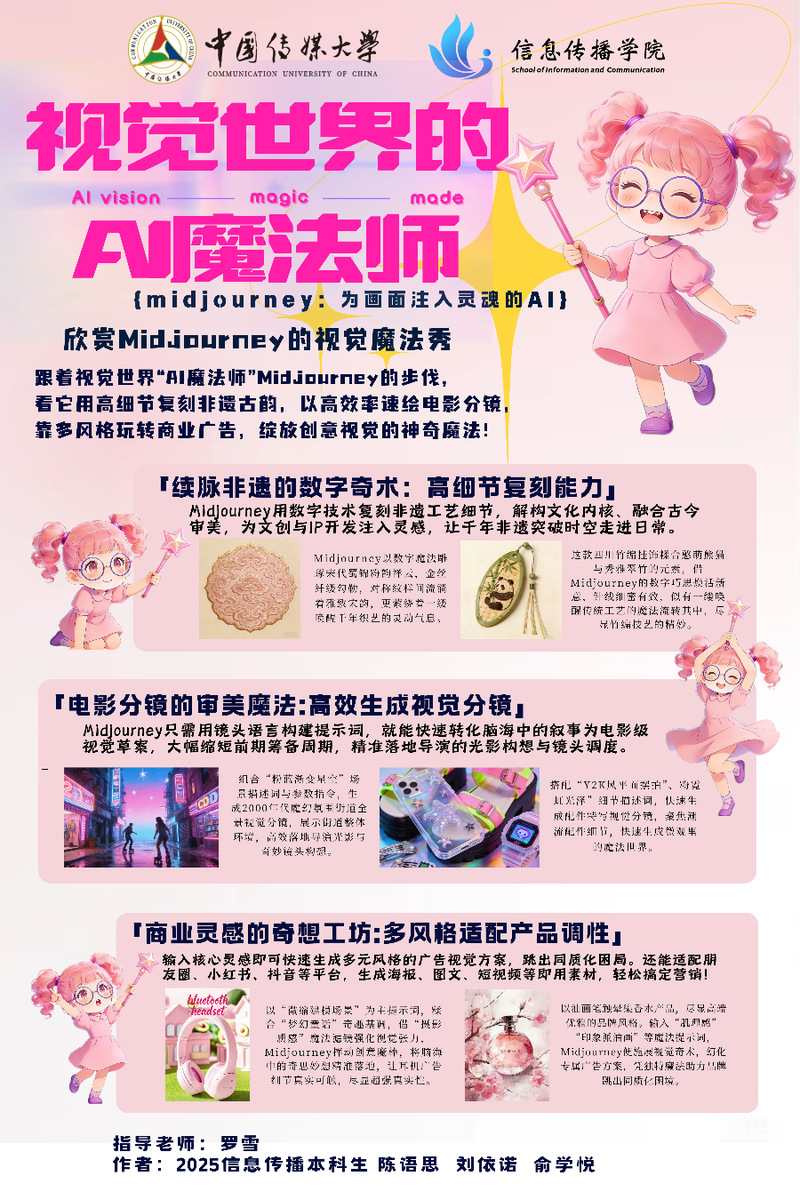 作品聚焦Midjourney的视觉创作魔力。海报从非遗复刻、电影分镜生成、商业广告适配三大维度展开,展现Midjourney用高细节还原非遗工艺、以高效能打造电影级视觉分镜、靠多风格适配产品调性的“魔法能力”,生动诠释了这款AI工具为文创、影视、商业领域注入的创意新活力。