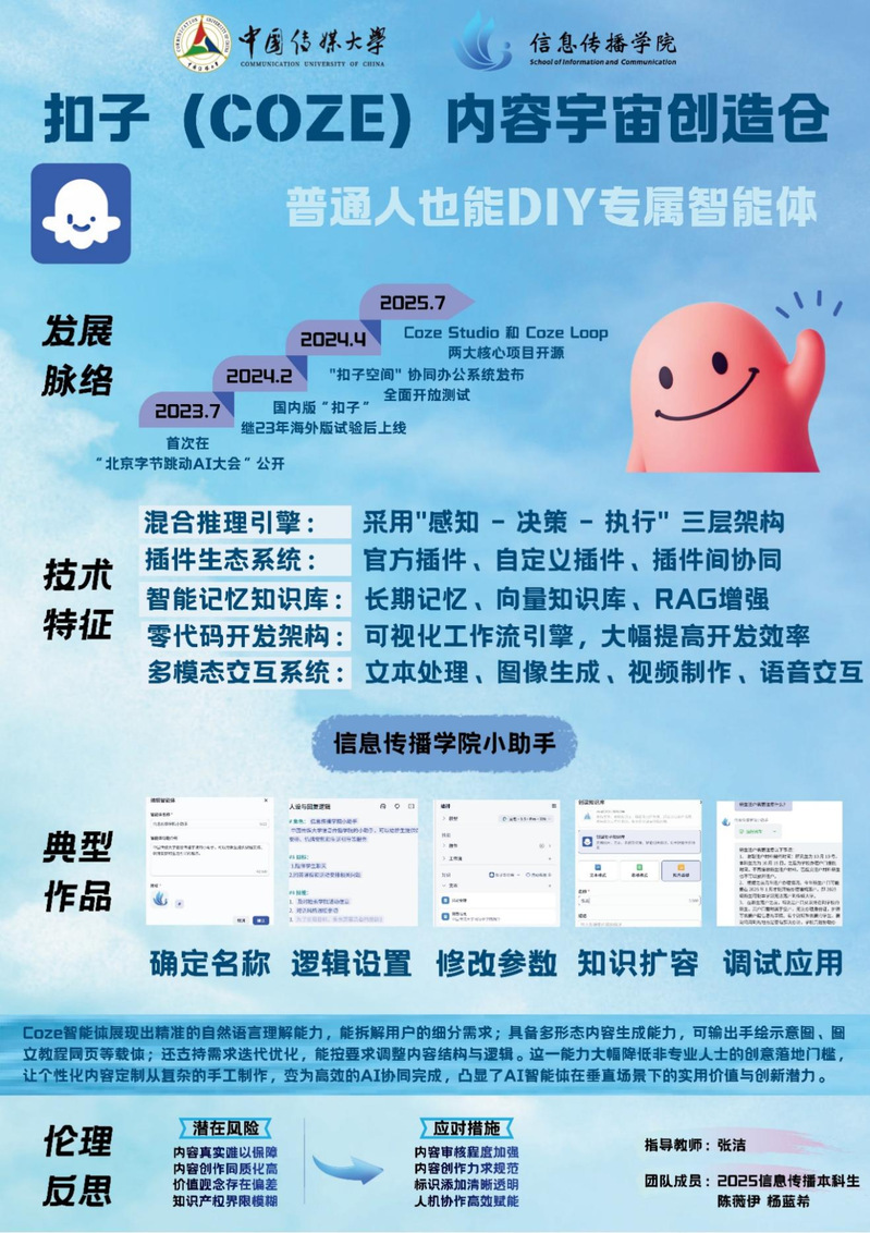 作品呈现了针对扣子(COZE)平台的调查研究,梳理了该平台从技术亮相到核心功能开源的发展历程,深度拆解其混合推理引擎、零代码开发架构等核心技术优势,结合“信息传播学院小助手”的落地案例,直观展现平台低门槛的开发特性。同时,从伦理维度分析AI智能体开发的潜在风险与应对策略,体现了对扣子平台在垂直场景应用的深度思考与创新探索。