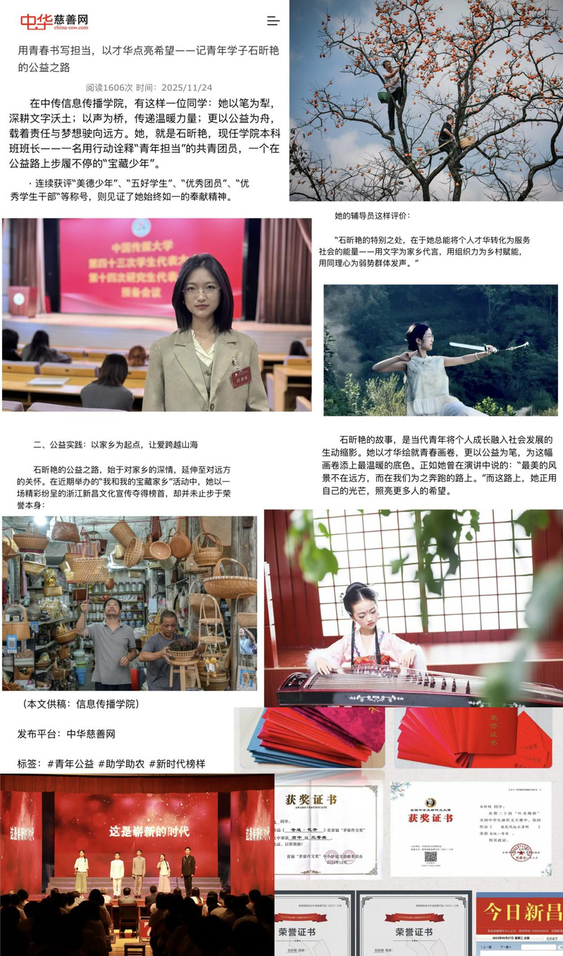 石昕艳同学以“承中华文脉,赴时代长歌”为主题,规划成长为一名文化推介员。“作为第一届信息传播专业的大一学生,守正创新、用专业能力传播好中华文化,是我的梦想,更是新时代中传学子的责任担当。”在从小到大实践经历和传统文化学习中,她深刻领悟到“文化是一个国家、一个民族的灵魂”,立志响应习近平总书记重要回信精神,成长为适配智能化信息社会的跨领域复合型人才。